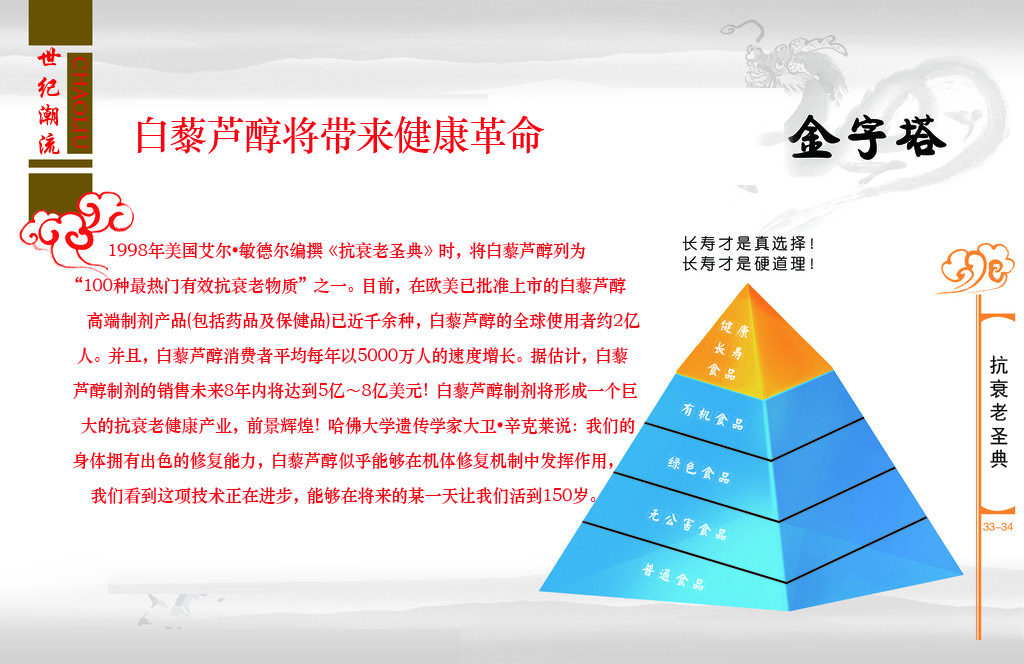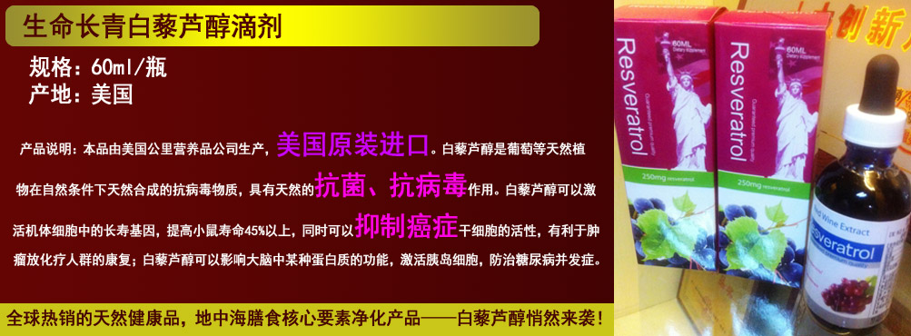 2013年3月《現(xiàn)代快報(bào)》報(bào)道,英國葛蘭素史克公司發(fā)現(xiàn)白藜蘆醇具有通過促進(jìn)被稱為“長壽基因”的SIRT1組蛋白脫乙酰酶的活力,起到延緩衰老的作用。據(jù)悉,長壽基因SIRT1DE 活力可以通過限制熱量攝取和運(yùn)動(dòng)等方式予以促進(jìn),同時(shí)也可以借助“活化劑”的作用。而天然物質(zhì)中最常見的“活化劑”就是白藜蘆醇,該物質(zhì)在紅酒就存在,但含量不多。一項(xiàng)通過葡萄提取濃縮白藜蘆醇的技術(shù)在美國真理營養(yǎng)品公司已經(jīng)取得成功,其濃縮的“生命長青”白藜蘆醇制劑在美國成為非常熱門的抗衰老圣品。