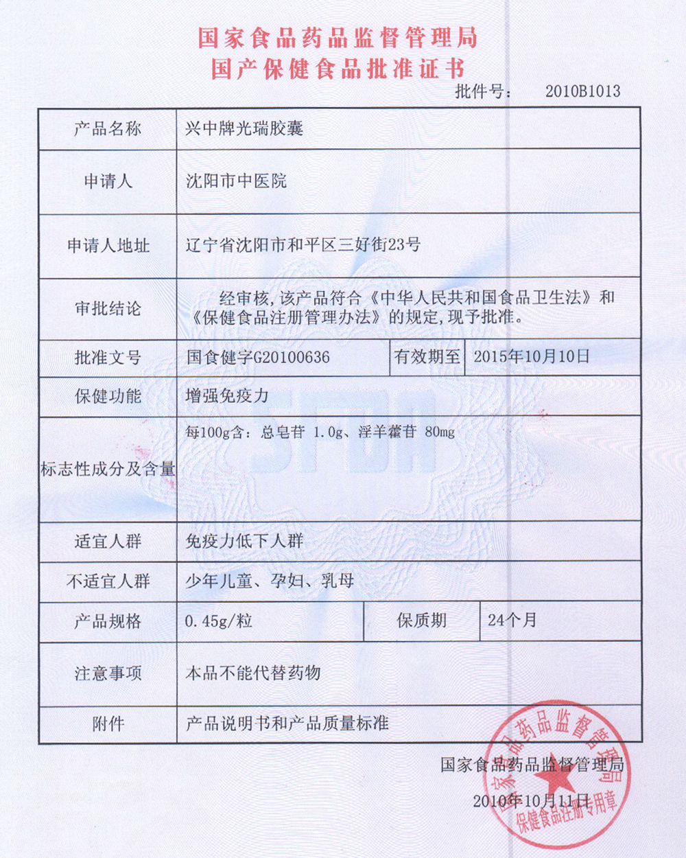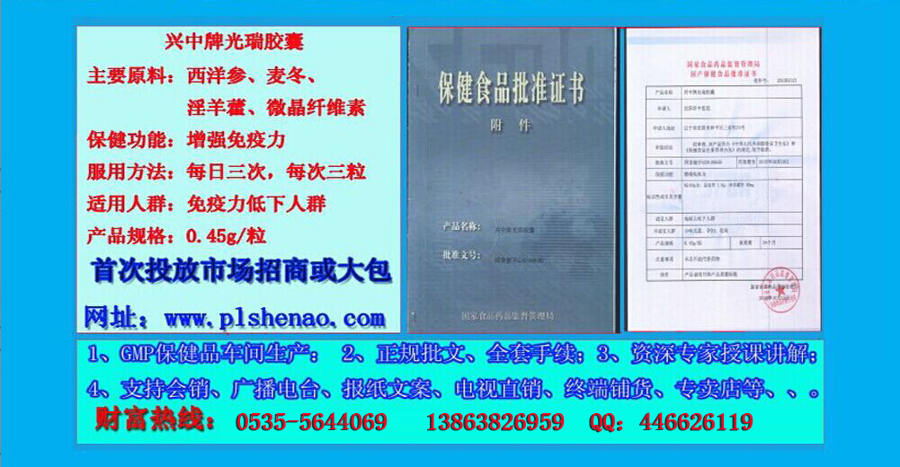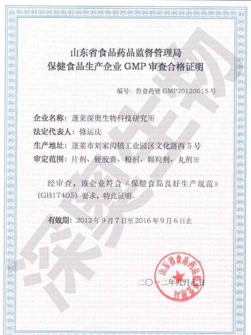 主要原料: 西洋參粉、海參凍干粉、葡萄籽提取物標志性成分及含量:每100g含:總皂苷0.94g、原花青素2.4g 保健功能: 增強免疫力 適宜人群: 免疫力低下者 不適宜人群: 少年兒童、孕婦、乳母 食用方法及食用量: 每日2次 ,每次2粒 批準文號: 國食健字G20110245 執(zhí)行標準: Q/PSA0003S-2011 GMP 認證號: 魯衛(wèi)藥健20120015