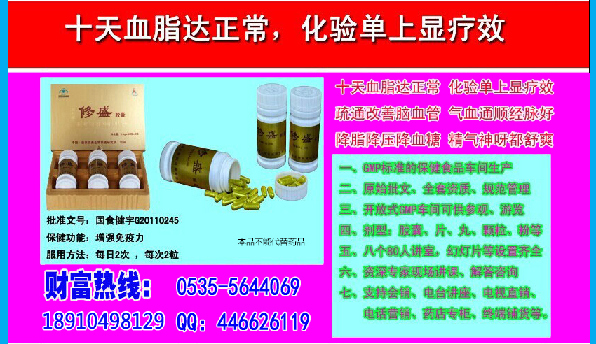 主要原料: 決明子、荷葉、山楂、海帶、烏龍茶、L-肉堿 標志性成分及含量: 每100g含:L-肉堿0.68g、總蒽醌0.047g 保健功能: 減肥 適應(yīng)人群: 單純性肥胖人群 不適應(yīng)人群: 孕期及哺乳期婦女 食用方法及食用量: 每日2次 ,每次3粒 批準文號: 國食健字G20060736 執(zhí)行標準: Q/PSA0004S-2011 GMP認證號: 魯食藥健GMP20120015號