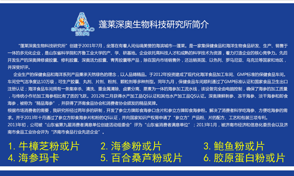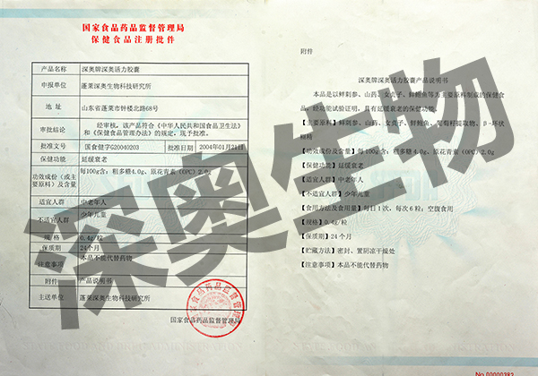 “深奧活力膠囊”是以鮮刺參、山藥、女貞子、鮮鮑魚等為主要原料制成的保健食品,經(jīng)功能試驗證明,具有延緩衰老的保健功能。