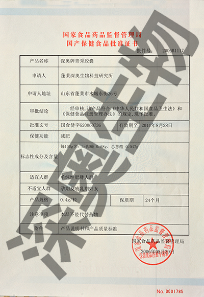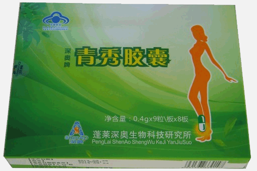 “深奧牌青秀膠囊”是以決明子、荷葉、山楂、海帶、烏龍茶、L-肉堿為主要原料制成的保健食品,經(jīng)動物功能和人體試食試驗證明,具有減肥的保健功能。