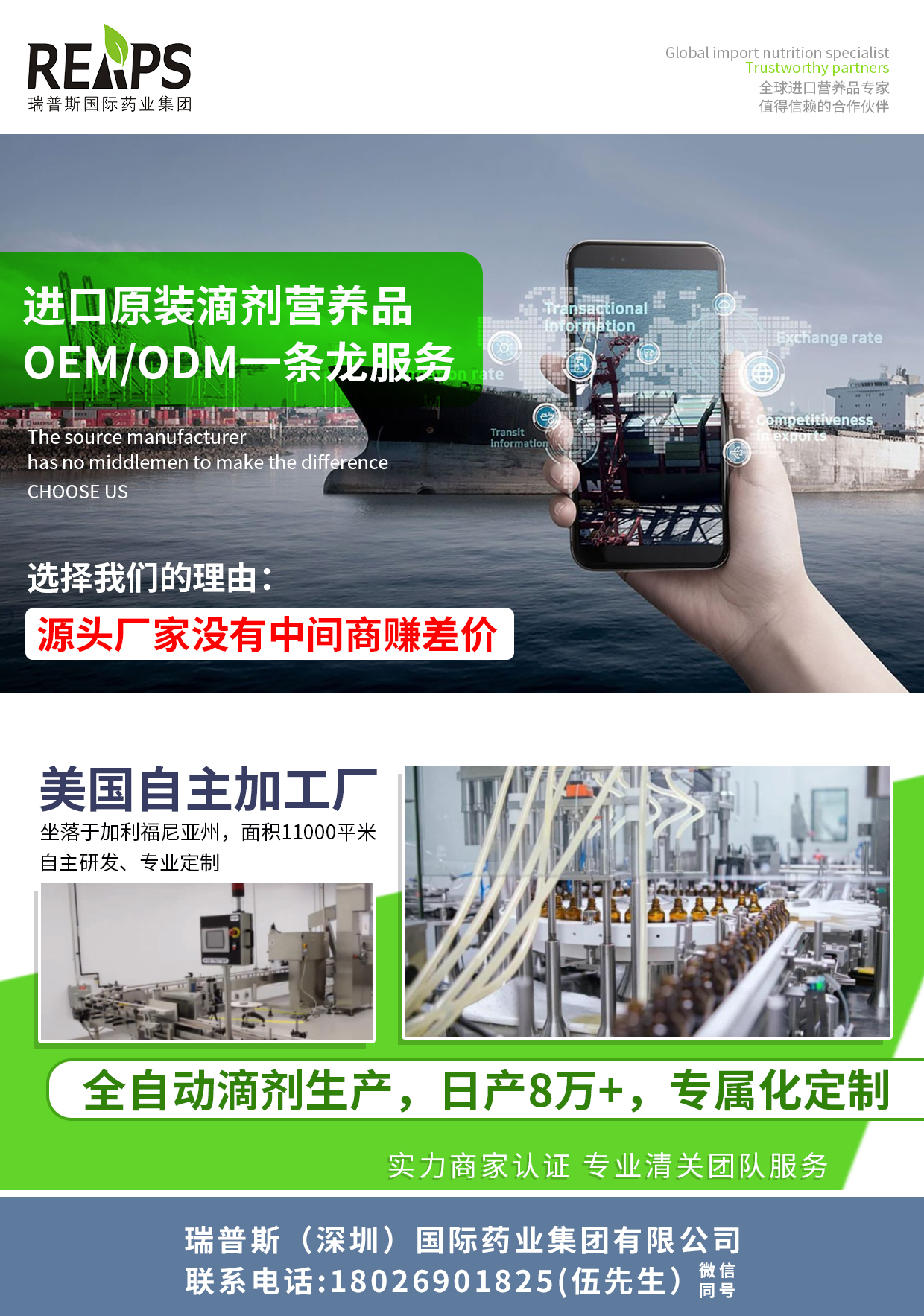 隨著市場的發(fā)展以及激烈的競爭,很多企業(yè)選擇找廠商代加工OEM服務(wù),瑞普斯藥業(yè)集團(tuán),在美國加州有自主加工廠,面積達(dá)11000平米,全自動滴劑生產(chǎn)設(shè)備已調(diào)試投入使用,日產(chǎn)量高達(dá)8w+,堅持采用天然原料,從原料采購到產(chǎn)品運輸,均嚴(yán)格按照最嚴(yán)格的FDA和cGMP標(biāo)準(zhǔn).瑞普斯藥業(yè)集團(tuán)還提供產(chǎn)品OEM清關(guān)一條龍,貨到港口,三天出證,運輸物流快,無通關(guān)壓力.